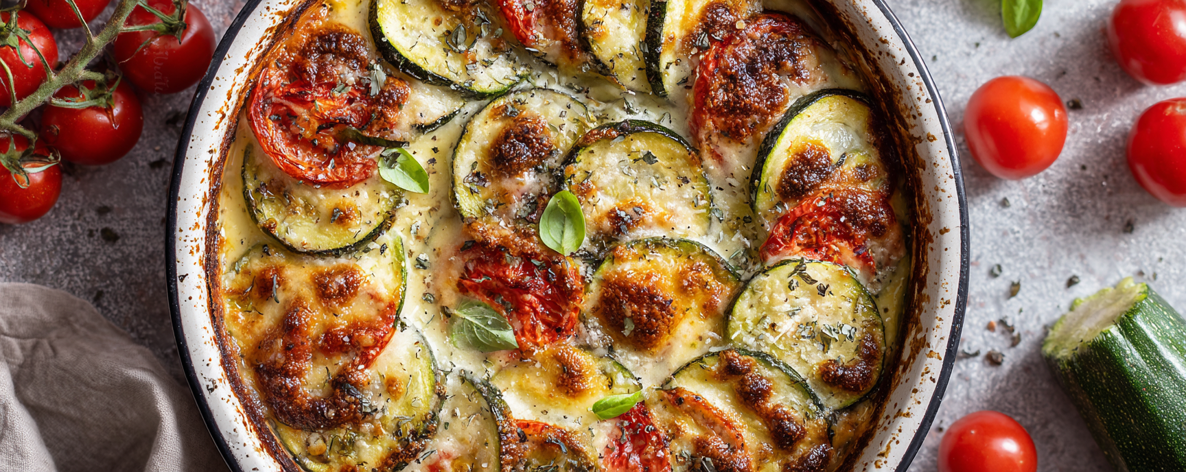 Zucchini Tomato Bake – zucchini, tomatoes, mozzarella, herbs.
